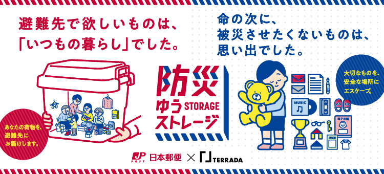 『避難が長期化した場合の防災備品』や『大切な思い出の品』を、居住地外にあらかじめ避難させておき、災害時にはゆうパックで避難先等へお届けするサービスです