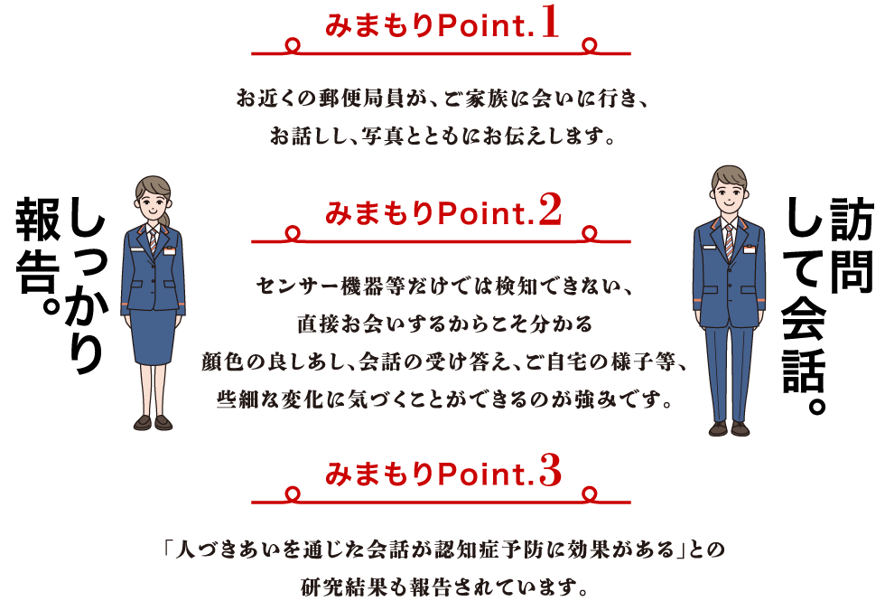センサー機器等だけでは検知できない、直接お会いするからこそ分かる顔色の良しあし、会話の受け答え、ご自宅の様子等、些細な変化に気づくことができるのが強みです。