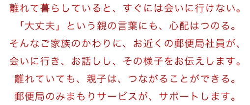 - 家族間では話題にあがらなかったことや心配かけまいと伏せていたことを、郵便局の人には話していたようで、報告書を通して知ることができました。知らない業者から営業があったことも報告書で知り、対処ができて感謝しています。