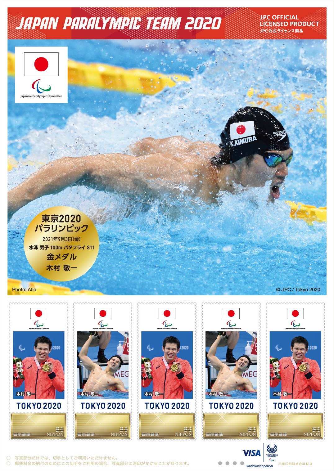 東京2020パラリンピック日本代表選手 メダリスト公式フレーム切手(水泳 男子 100m バタフライ S11 木村 敬一選手)2021年9月5日