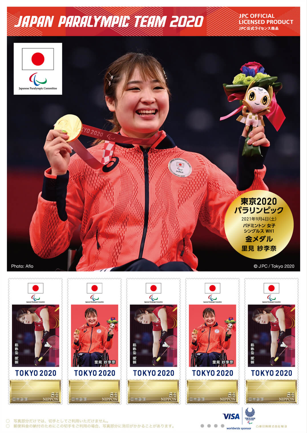 東京2020パラリンピック日本代表選手 メダリスト公式フレーム切手(バドミントン 女子 シングルス WH1 里見 紗李奈選手)2021年9月6日