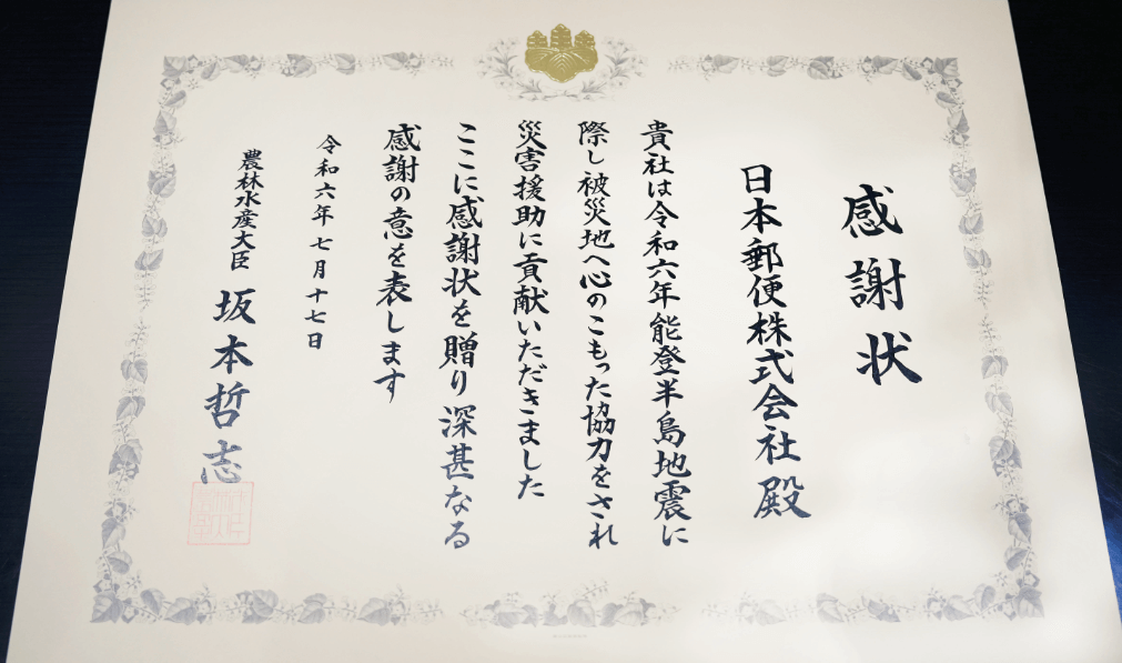 日本郵便株式会社(東京都千代田区、代表取締役社長 千田 哲也、以下「日本郵便」)は、令和6年能登半島地震に際し、被災地への飲食料品等の緊急物資輸送に協力したとして、農林水産大臣から感謝状を受領しましたのでお知らせします。