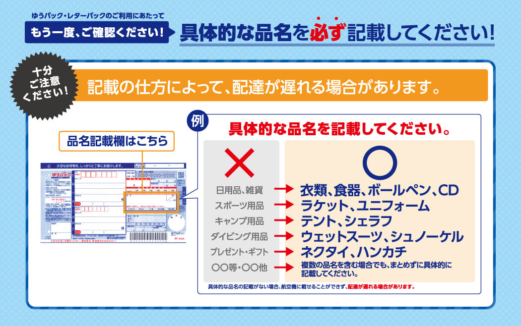 内容品によっては、具体的品名のほか航空機による輸送ができないものに該当しないことを確認するため、品名記載欄への追記をいただく場合があります。