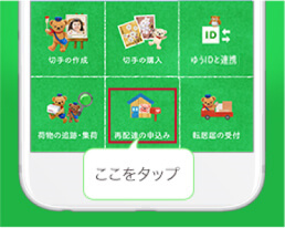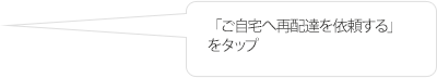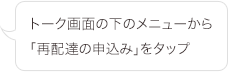 再配達のお申し込みを行なうには、トーク画面の下のメニューから「再配達の申込み」をタップしてくださいね。