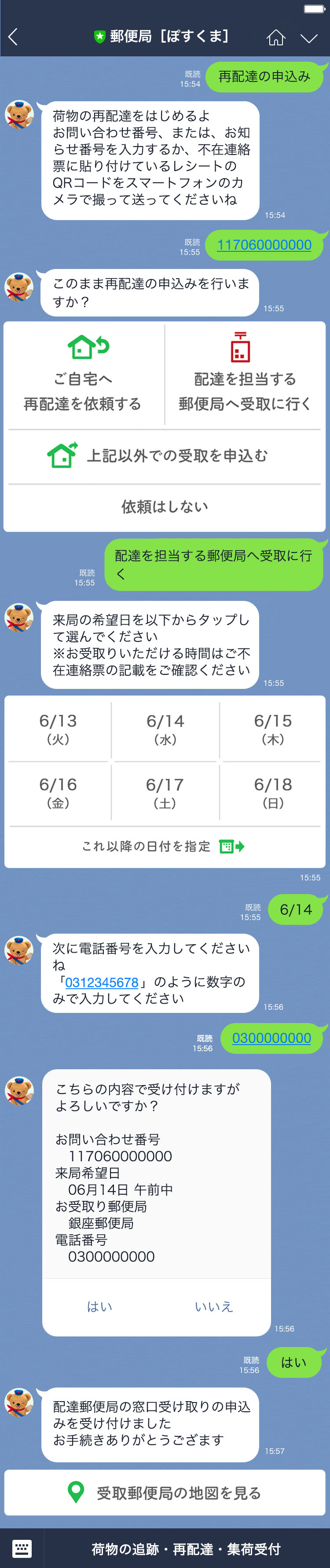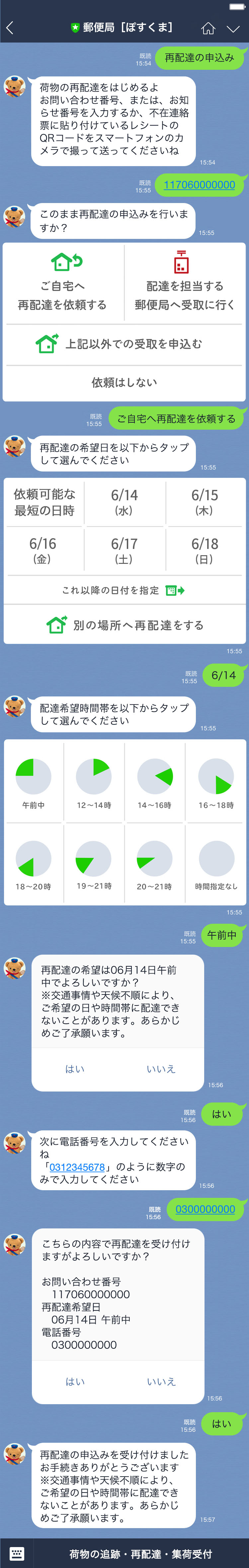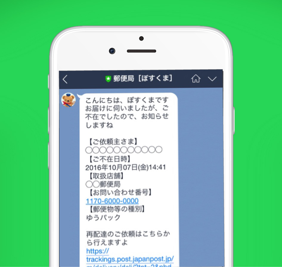 LINEのトークで、配達希望日時などを送ると再配達のお申し込みが簡単にできるよ。