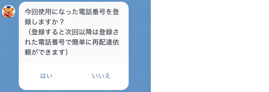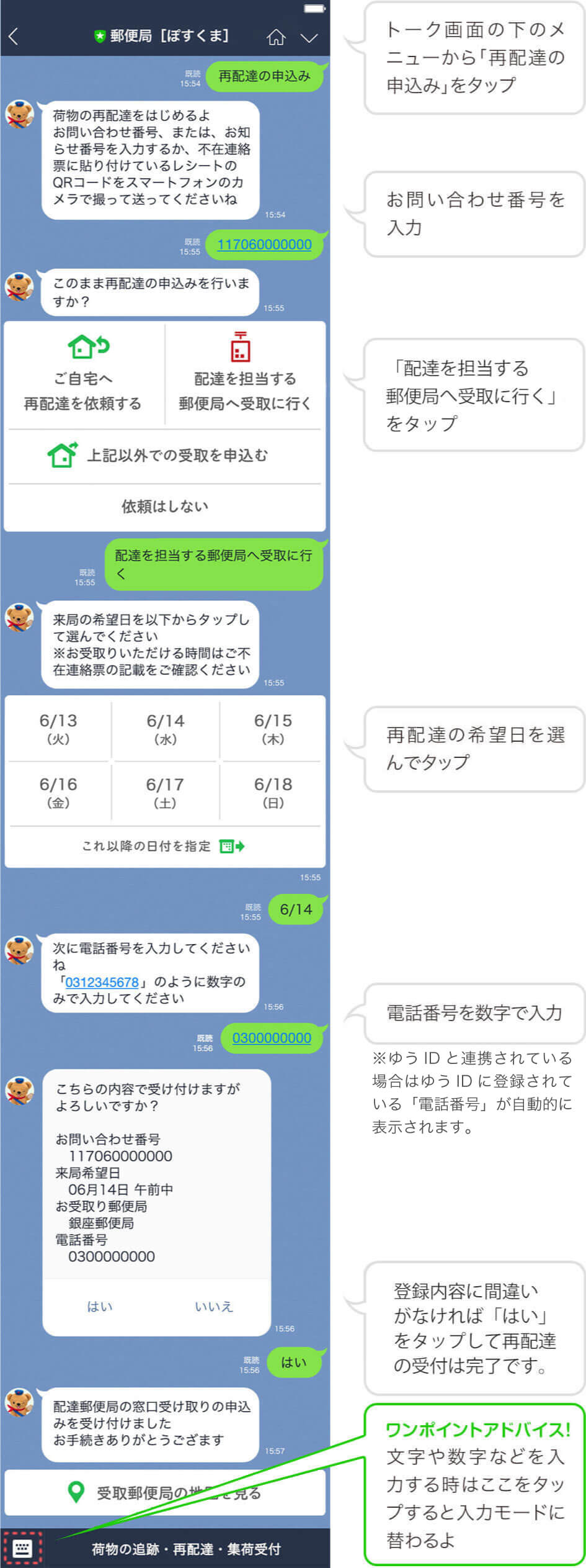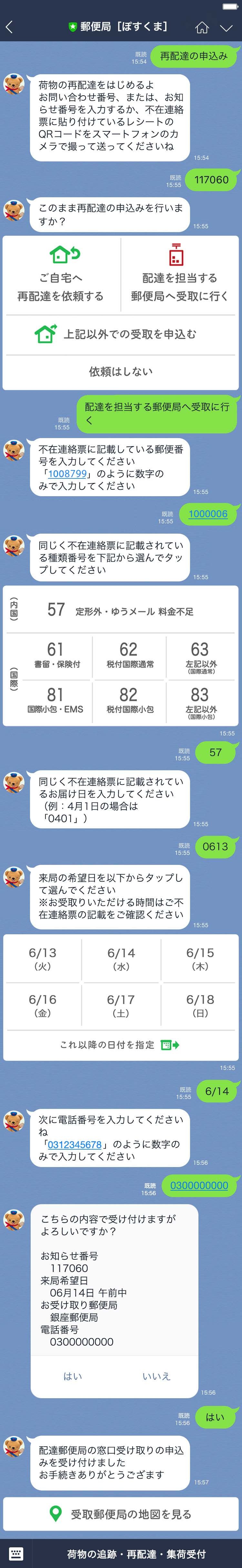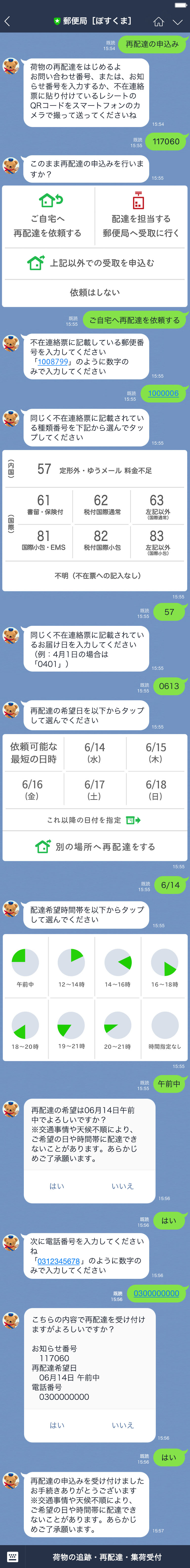 LINEのトークで、配達希望日時などを送ると再配達のお申し込みが簡単にできるよ。