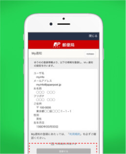 ④ログインするとゆうIDの登録内容を使い、My通知の登録画面が表示されるよ。利用規約に同意して、登録をすすめてくださいね。