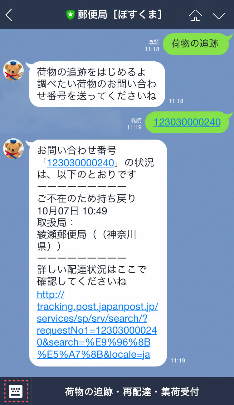LINEのトークにお問い合わせ番号を送ると簡単に配達状況が確認できるよ。
