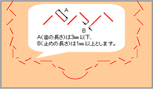 そのミシン目は、歯の長さ3mm以下、止めの長さ1mm以上とします。