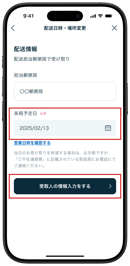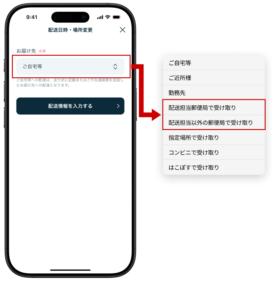 - 選択いただいた郵便局の場所によっては、お荷物のお受け取り可能日が1日以上加算される場合があります。