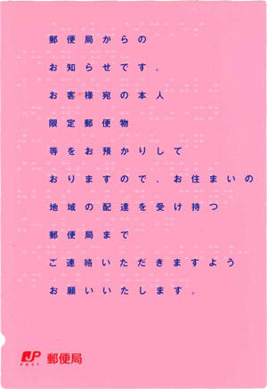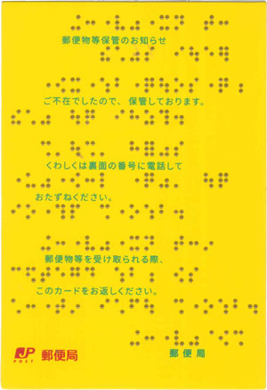 点字の不在連絡票など(点字不在配達通知カード、本人限定受取郵便物等到着通知カード)