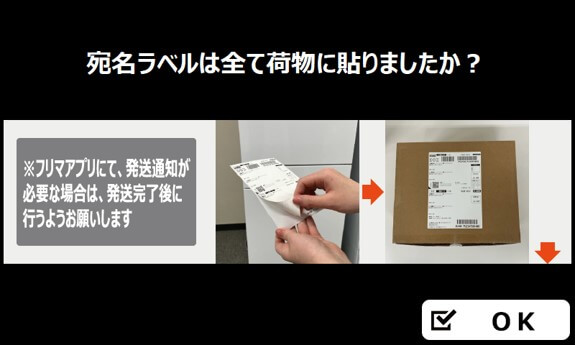 - ⑥コードリーダーにかざした宛名ラベルを荷物に貼付し、〔OK〕を押してください。