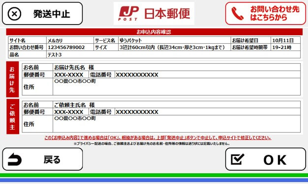 - ⑥コードリーダーにかざした宛名ラベルを荷物に貼付し、右下の〔OK〕を押してください。