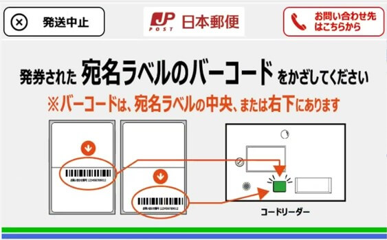 - ⑤発券された宛名ラベルのバーコードを、コードリーダーにかざしてください。