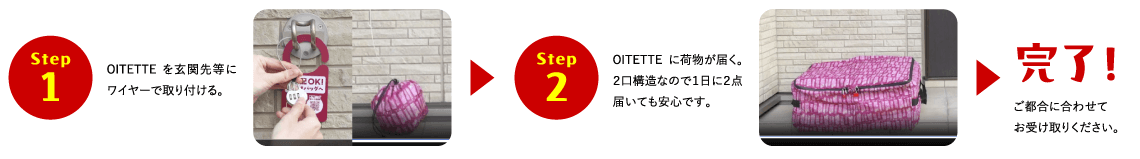 JPコミュニケーションズ株式会社が販売している「OITETTE(おいてって)」がおすすめです。「OITETTE」とは玄関先などに設置し、100サイズ相当の宅配物が2点収納できる2口構造の置き配バッグです。宅配ボックスのようにお使いいただけます。
