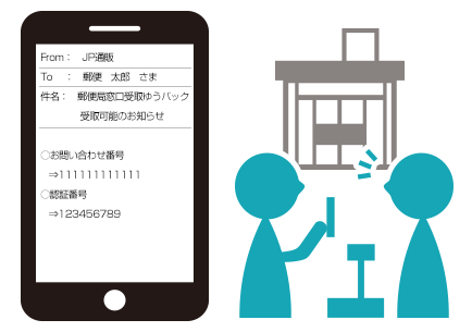 郵便局窓口で、商品を購入したECサイトまたは、日本郵便から届いた受取可能を知らせるメール等を提示いただきます。
