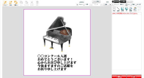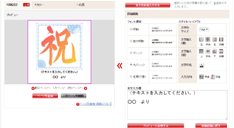文例を選んで、編集画面でオリジナルな文面を追加したり、フォントの字体や色、大きさを調整するだけで作成可能。