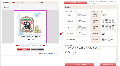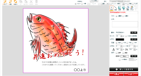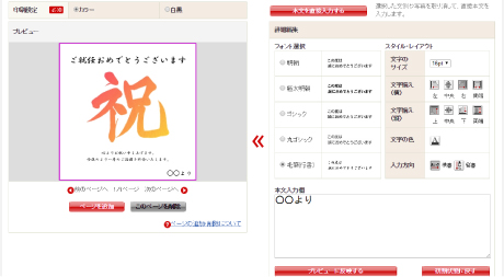 文例を選んで、編集画面でオリジナルな文面を追加したり、フォントの字体や色、大きさを調整するだけで作成可能。