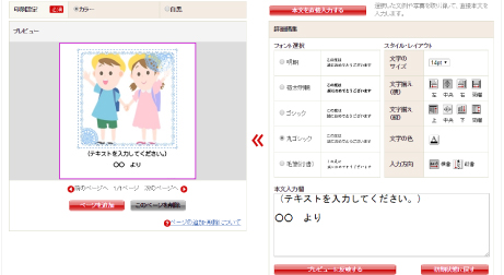 文例を選んで、編集画面でオリジナルな文面を追加したり、フォントの