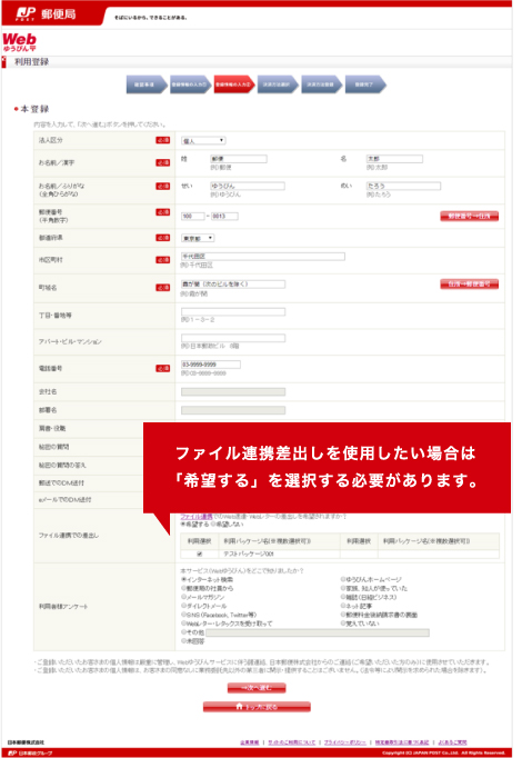 ※ファイル連携差出し(Webレター、Web速達)を希望する場合、「希望する」を選択していただく必要があります。