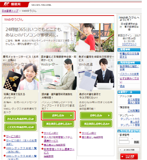 ①Webゆうびんトップページに接続し、ログイン後、Webレター「お申し込み」ボタンを押します。