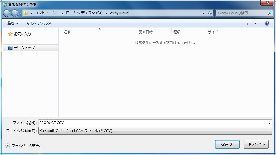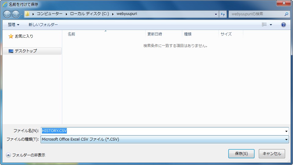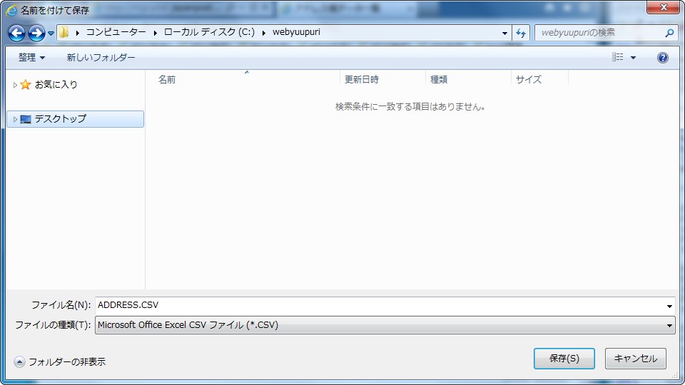 名前を付けて保存ダイアログにて保存先を指定し、ファイルの種類を「CSVファイル」に選択してから、ファイル名を入力して「保存」を選択します。 デフォルトは、 これでCSVファイルのダウンロードは完了です。 |
