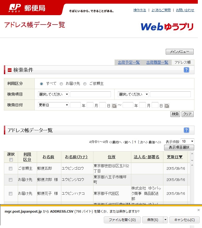 | 1 | 利用区分 | ご依頼主の場合は「0」、お届け先の場合は「1」が出力されます。 |