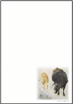 親牛の堂々たる大きさと、可愛い仔牛のしなやかさとが対照的に表現されています。