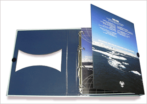 内表紙付きのハードカバー製バインダー式アルバムで、各ページ、リーフレットに開いた綴じ穴4箇所をストッパー付きの金具で綴ります。