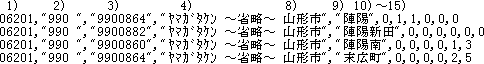 - 各項目は、半角の「,」(カンマ)で区切っており、上記の2)~9)までの項目は「"」(ダブルクォーテーション)で囲んでいます。