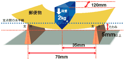 - 70mm間隔の支点の中間に2kgの荷重をかけて、郵便部のどの部分を計ってもその部分が5mm以上たわむこと。