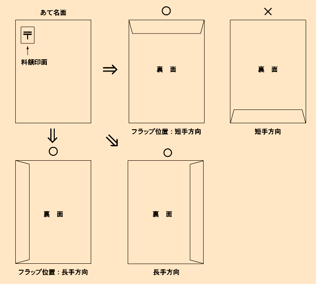 - フラップの位置は、短手方向に設ける場合には料額印面部分の裏側、または長手方向の裏側に設けること。また、フラップは、封筒または袋の納入口またはこれに相当する部分の全部を送達中容易に開かないように封じるために折り曲げたとき、あて名記載面と重ならない位置に設けること。