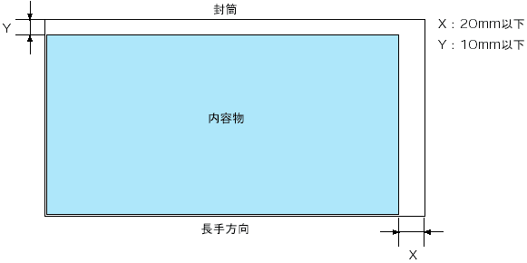 - 封筒に内容物を入れた際に、封皮と内容物の大きさの差は以下の条件を充たし、封筒自身のこわさは、2軸延伸ポリプロピレンフィルム(OPP)の厚さ40μmの封筒のこわさを基準とし、それと同等以上のものとすること。 郵便物の内容物を片側に寄せた場合に、封皮と内容物の空きがそれぞれ下記の長さ以下になること(封筒の大きさには、熱溶着部分等の封筒の周辺部を含むものとする)。